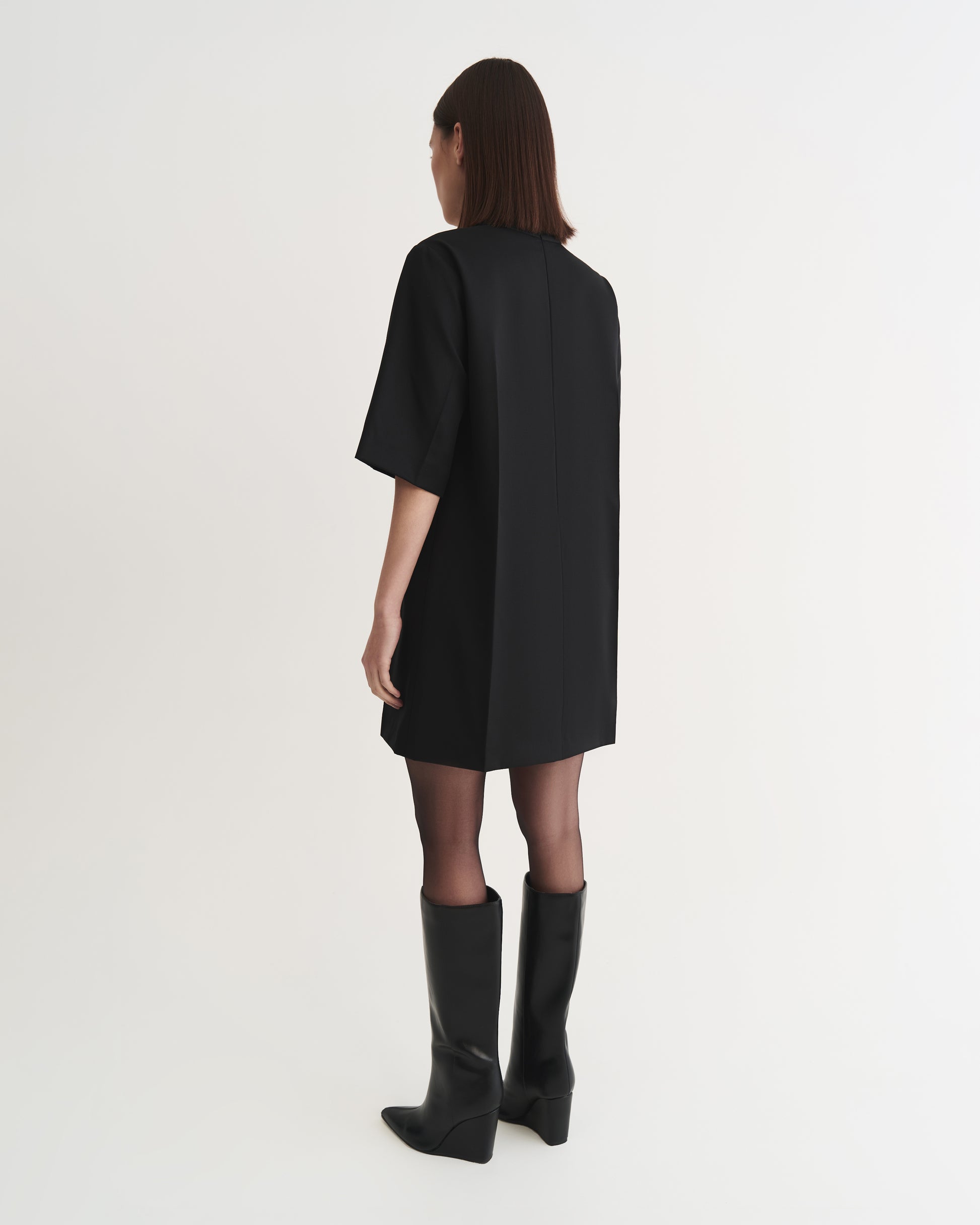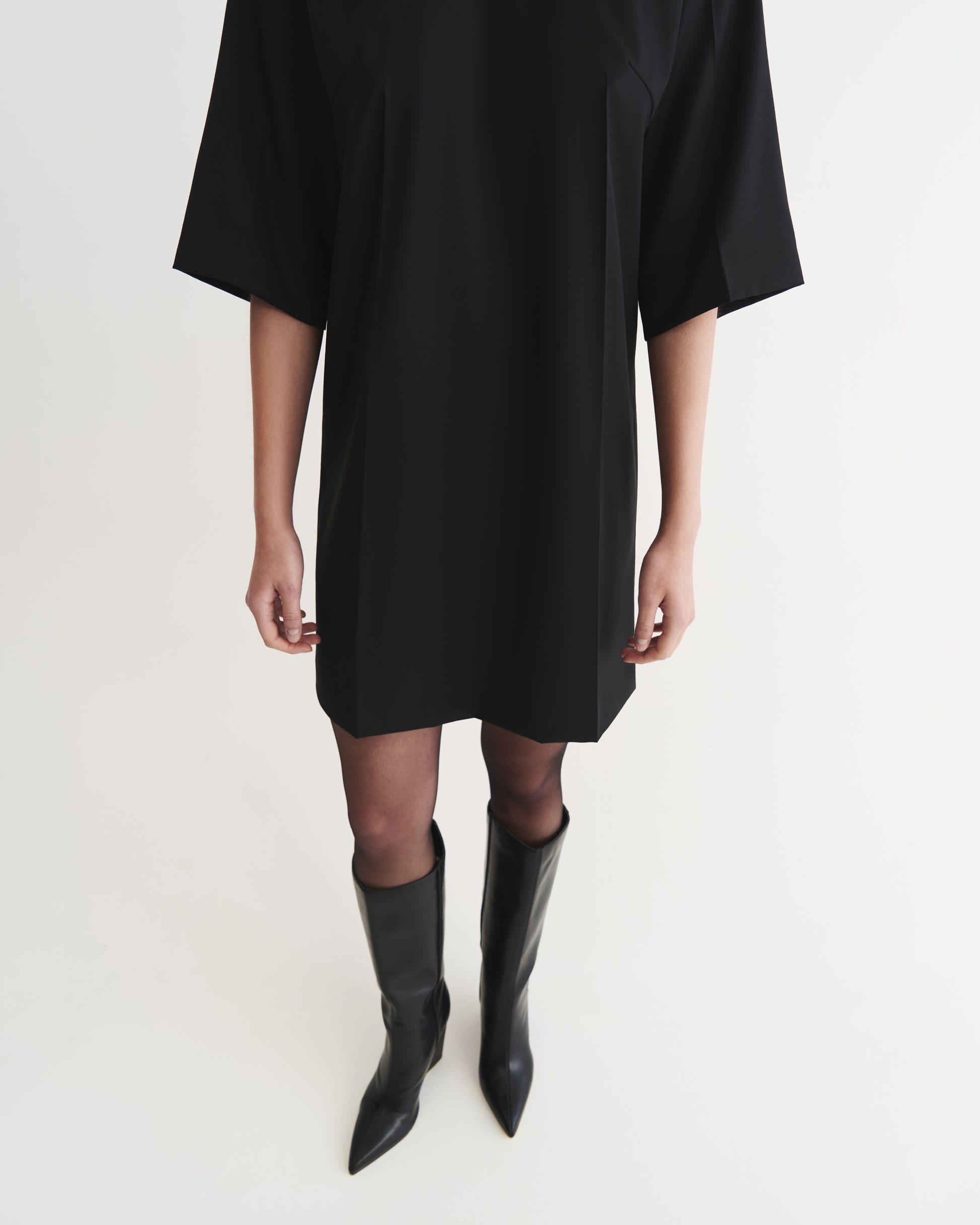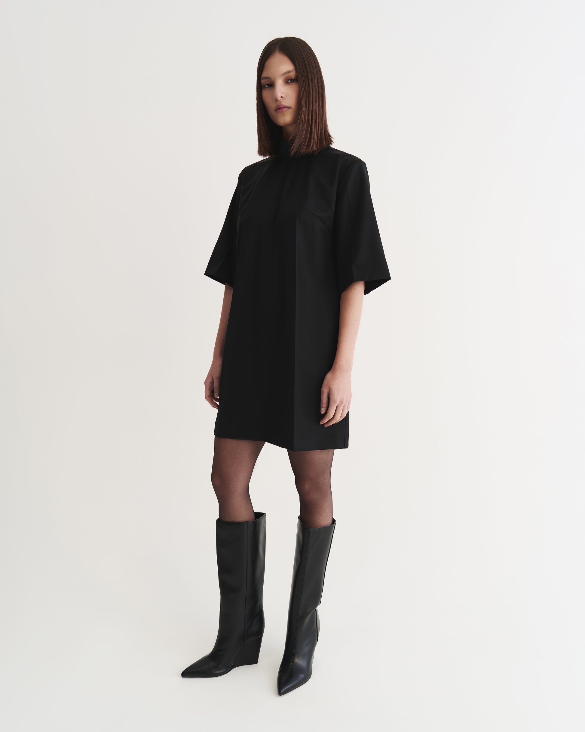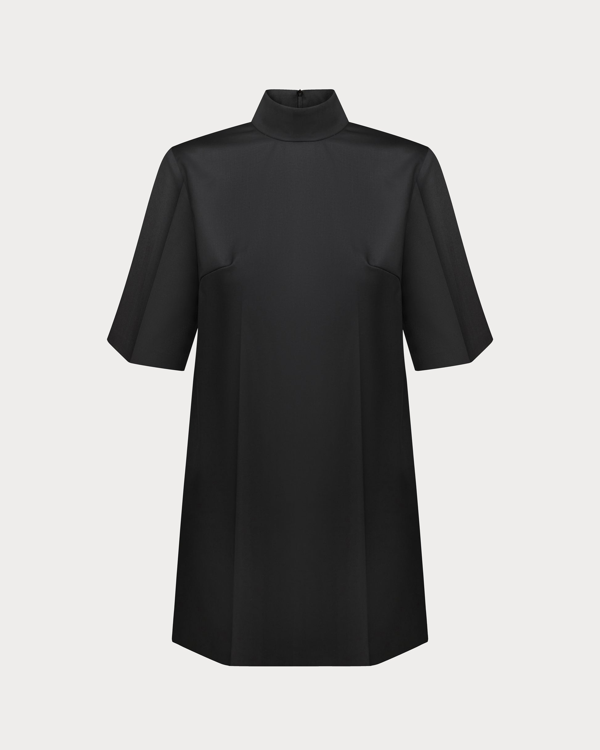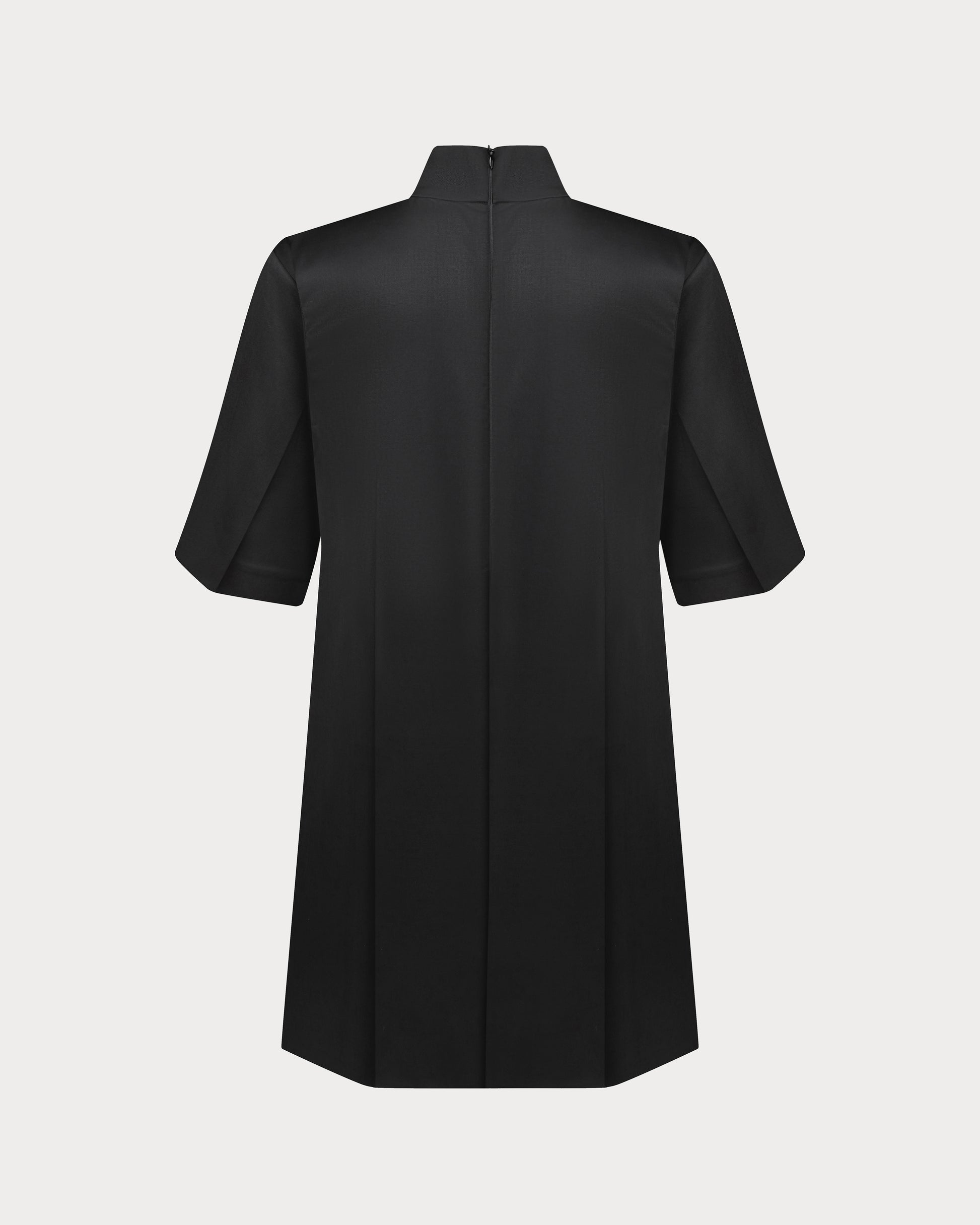 Коротка чорна сукня RAĀ FORMS має високий комір і широкі рукава до ліктя. Спокійний, прямий крій забезпечує легку, невимушену посадку, роблячи сукню універсальною для денних і вечірніх образів.