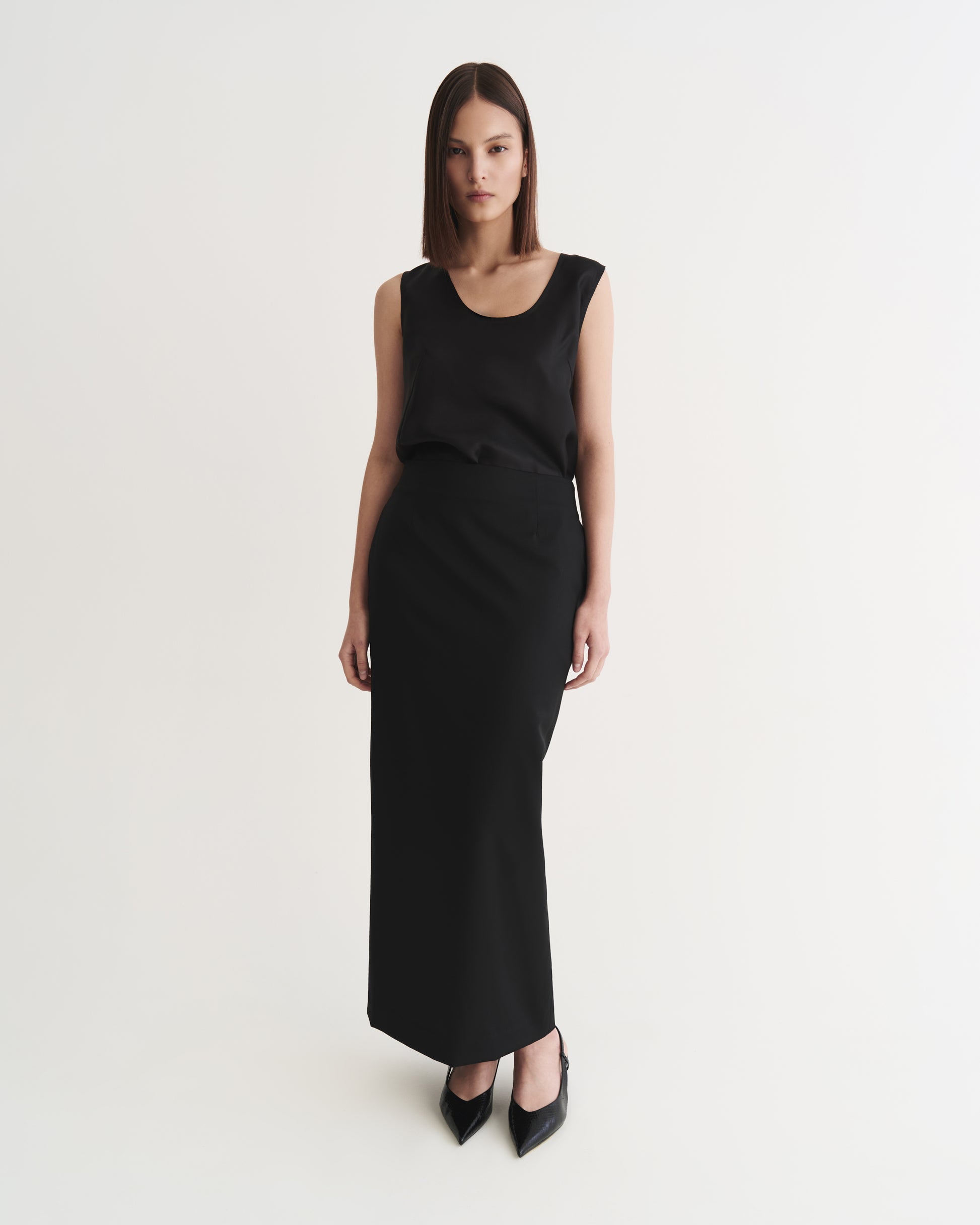 Спідниця довжини до щиколотки, яку можна стилізувати з футболкою вдень і з піджаком увечері. Виготовлена з вовни середньої щільності, має підкладку середньої довжини, сідає на талію й формує прямий силует, доповнений функціональними кишенями у швах.