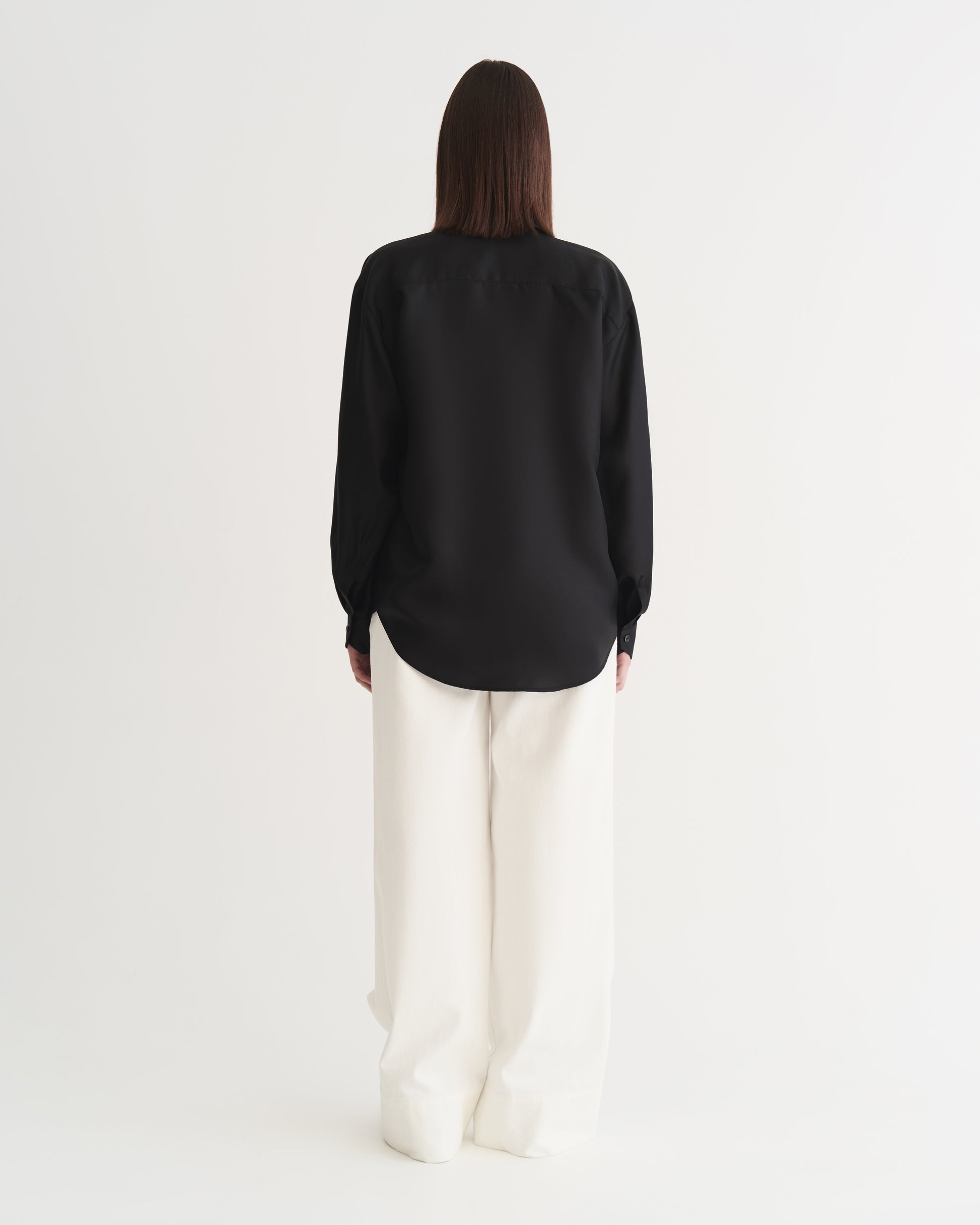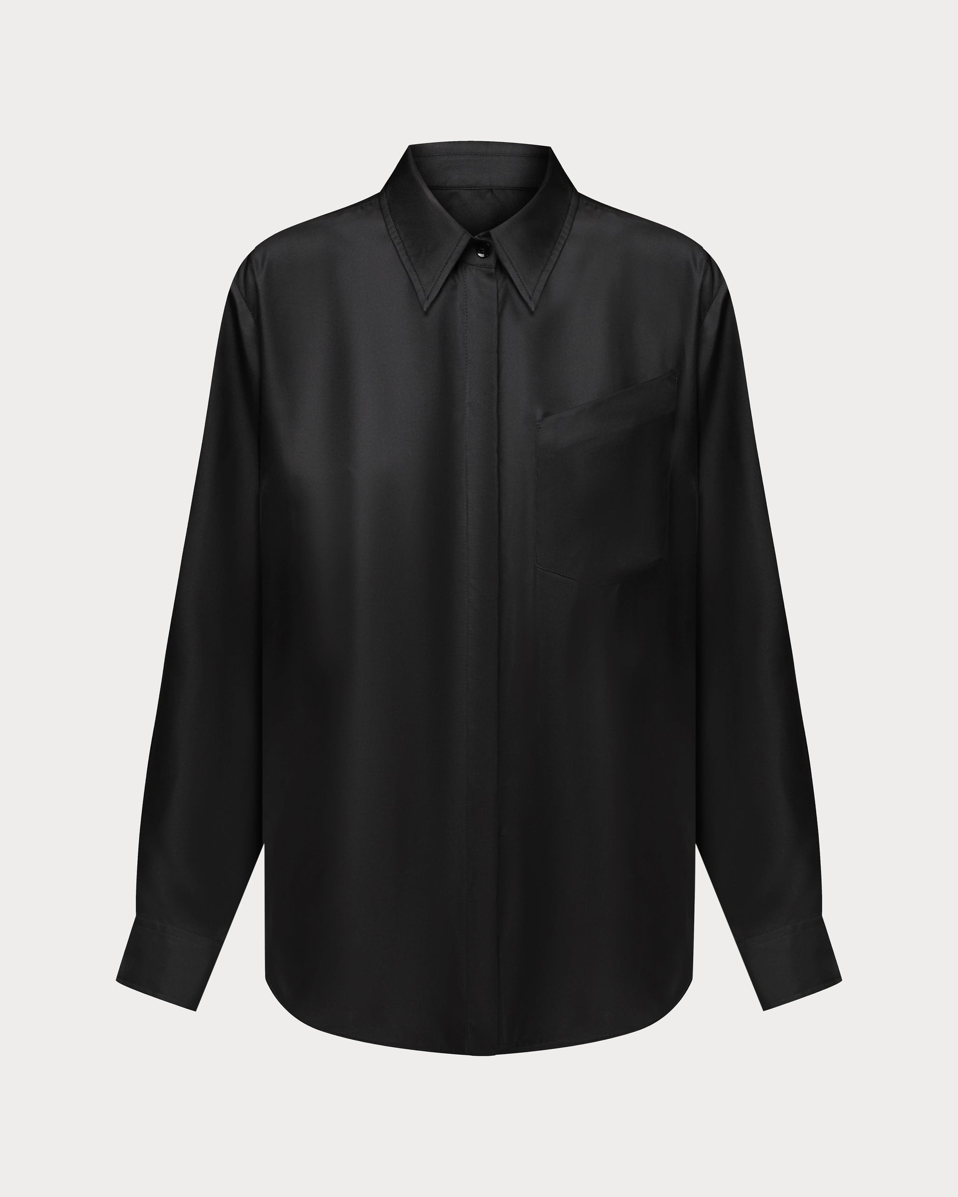 Шовкова сорочка чорного кольору, виконана з твілового натурального шовку. Має м’який блиск, асиметричну кишеню та ґудзики з натуральної мушлі. Легка, комфортна й доречна для будь-яких подій, вона приємно торкається тіла, зберігає структуру та елегантно тримає форму.